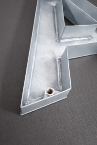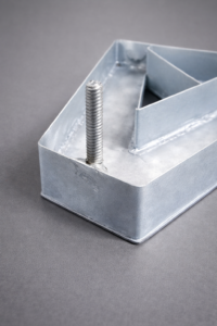 A fixação com pino central é utilizada na instalação de letras caixa e peças metálicas por meio de um único ponto de apoio localizado no centro da peça. Consiste na soldagem de um pino central na parte traseira, que é encaixado em um furo previamente feito na superfície de fixação, garantindo posicionamento e alinhamento corretos.